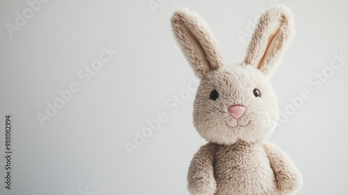 A soft, plush bunny toy with long ears and a friendly smile against a light background.