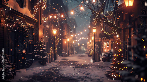 A soft snowfall covering a New Yeara??s Eve decorated street with glowing streetlights,