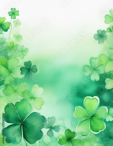 A soft watercolor background with green clovers surrounding a blank copy space, perfect for St. Patrick’s Day designs, invitations, and festive branding.