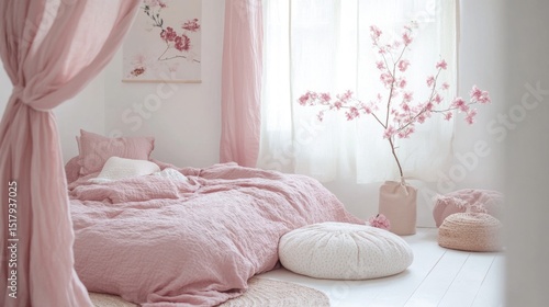 A softly lit pink and white bedroom with layered bedding, floral art, a plush floor cushion, and natural light filtering through soft curtains