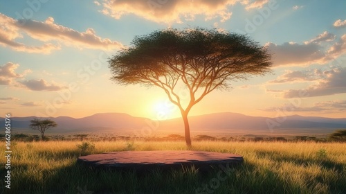 A solitary acacia tree stands on a grassy plain at sunset with warm sunlight casting long shadows and distant mountains beneath a partly cloudy sky