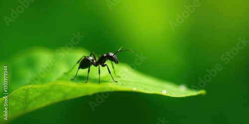 A solitary black ant explores a vibrant green leaf, showcasing the delicate balance of nature's intricate ecosystem.