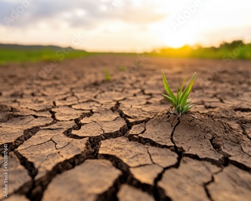A solitary blade of grass grows through cracked earth during sunset, symbolizing resilience in harsh conditions.
