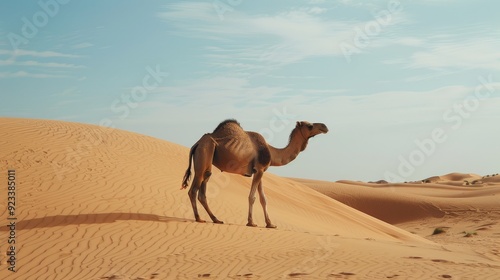 A solitary camel stands amidst the vast, rolling sands of a sunlit desert landscape, with clear blue skies accentuating the sense of solitude and serenity.