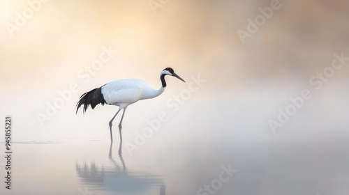 crane, bird, water, sunrise, dawn, fog, mist, tranquil, serene, graceful, elegant, nature, wildlife, animal, feathered, beak, wing, leg, duck pond, lake, landscape, morning, golden hour, peaceful, harmony, balance, beauty, awakening, life, longevity, japan, asia, photo, digital artwork, minimalist, abstract, calm, stillness, serenity, zen, spiritual, hope