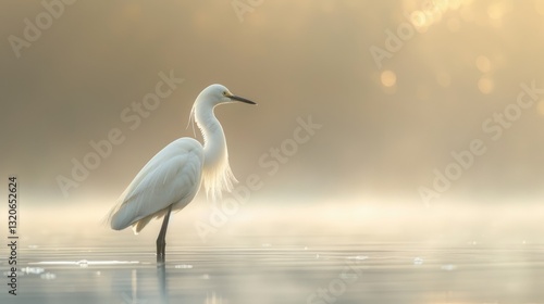 A solitary egret stands gracefully in the misty water at dawn, surrounded by soft golden light, evoking peace and tranquility.