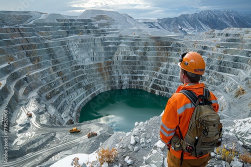 engineer, landscape, winter, reflective, gear, pit, mining, contemplation, industrial, immensity, industry, work, solitude, perspective, safety, labor, extraction, natural resource, geology, quarry, management, environment, ore, equipment, heavy, machinery, operation, survey, rock, mineral, dig, construction, exploration, earth, research, quarrying, excavation, metallic, men at work