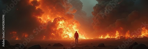 A solitary figure confronts a vast inferno.