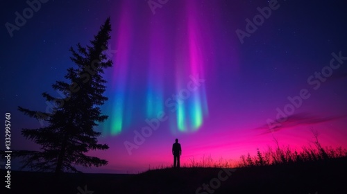aurora, borealis, night, sky, star, colourful, light, vibrant, nature, landscape, man, silhouette, tree, pine, peaceful, calm, wonder, amazing, beautiful, spectacular, photo, astronomy, science, cold, winter, northern, adventure, travel, explore, scenic, stunning, view, moment, silence, beauty, dark, horizon, grass, field, alone, awe, inspire, magic, surreal, dream, powerful, meditation