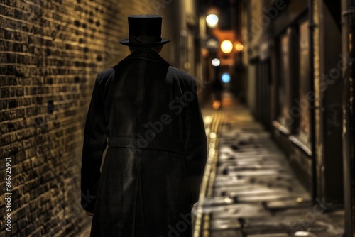 man, woman, detective, mystery, investigation, crime, thriller, fiction, novel, story, literature, century, victorian, era, black, coat, top, hat, walking, darkness, shadow, alleyway, urban, city, night time, evening