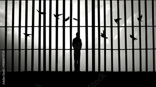 A solitary figure stands before a barred window, gazing out at a flock of birds soaring in the sky.