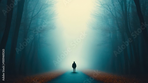 A solitary figure stands on a misty path in the woods, evoking feelings of solitude and introspection, Ideal for themes of loneliness, reflection, or mysterious journeys,