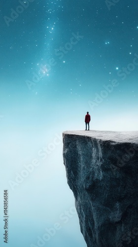 A solitary figure stands on the edge of a rocky cliff, gazing into the vast starry night sky filled with shimmering stars and ethereal blue tones, embracing tranquility and wonder