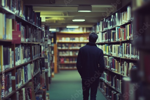 A solitary figure strolls down the narrow aisles of a library, absorbing the tranquility. Books line the shelves on either side, creating a peaceful atmosphere for exploration and study