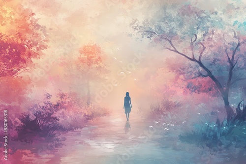 woman, figure, silhouette, forest, tree, branch, leaf, path, water, river, stream, light, sky, cloud, bird, flying, dream, aethereal, mystical, magical, fantasy, whimsical, pastel, pink, purple, blue, green, orange, yellow, art, painting, abstract, soft, delicate, serene, peaceful, calm