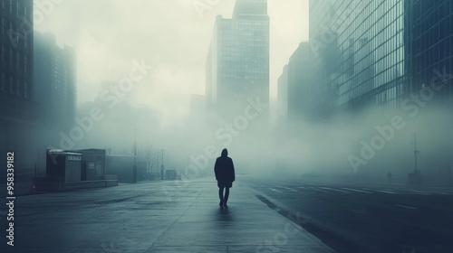 A solitary figure walks through a foggy city street, shrouded in mist and anonymity.