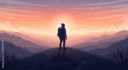 A solitary hiker with a backpack stands on a mountain summit, gazing at the beautiful sunset over a vast, layered landscape. An illustration of adventure and exploration