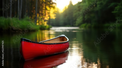 A solitary red canoe glows under the warm hues of sunset, gently resting on the still waters of the lake, encapsulating a moment of peaceful solitude and natural beauty.