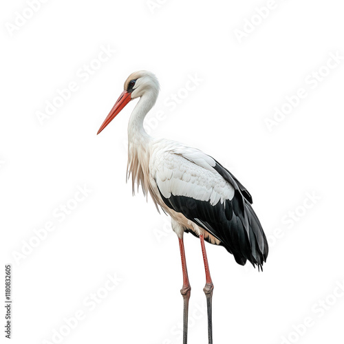 a solitary stork stands gracefully on two long legs against a minimalistic white background. showcasing its elegant posture and distinctive features. including a long red beak and contrasting black an