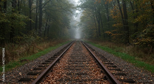 A solitary train track disappears into the misty, autumn forest, evoking a sense of journey and mystery