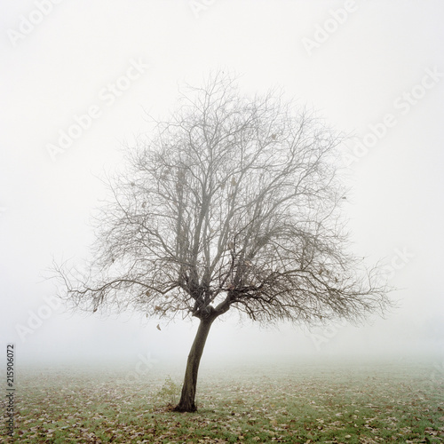 A solitary tree in autumn mist