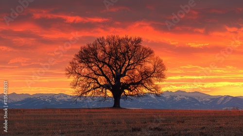 A solitary tree silhouetted against a vibrant sunset over a mountainous landscape.