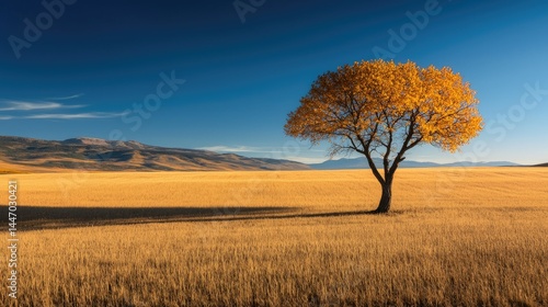 tree, field, landscape, sky, nature, sunshine, gold, yellow, autumn, horizon, sunlight, shadow, isolated, scenic, outdoors, view, environment, foliage, branch, trunk, season, daylight, peaceful, calm, calmness, beautiful, huge, expansive, open, solitary, rural, area, space, earth, air, wind, warm, clear, background, composition, simple, colours, light, vibrant, distance, mountain