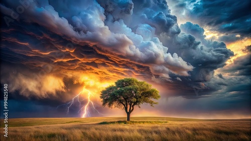 A solitary tree stands strong against a dramatic backdrop of a thunderous sky, a brilliant flash of lightning illuminating the ominous clouds above