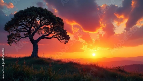 A solitary, weathered tree stands tall against a sunset , isolated, silhouette