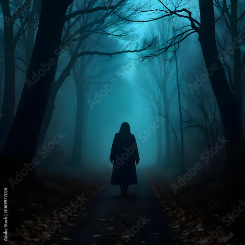 A solitary woman walks along a misty forest path, shrouded in darkness and fog.