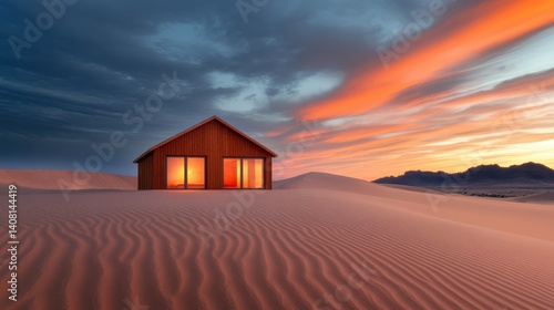 A solitary wooden house set against the backdrop of a stunning sunset in a vast desert, highlighting the contrast between nature and human architecture.