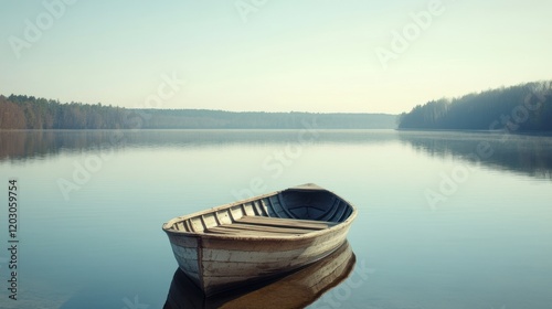 boat, lake, water, calm, serene, peaceful, quiet, still, tranquil, wood, wooden, dinghy, old, vintage, rustic, lonely, solitude, nature, landscape, scenery, summer, morning, dawn, sun, light, sky, tree, forest, shoreline, bank, horizon, stillness, peace, serenity, calmness, quietude, simple, elegant, beauty, atmosphere, mood