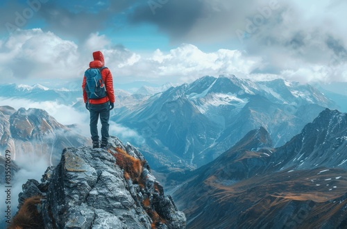 A solo adventurer conquers the mountain peak, basking in a sea of clouds