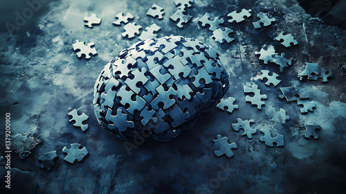 sombre, illustration, scattered, puzzle, piece, brain, fading, edge, memory, loss, muted, blues, dramatic, lighting, casting, shadow