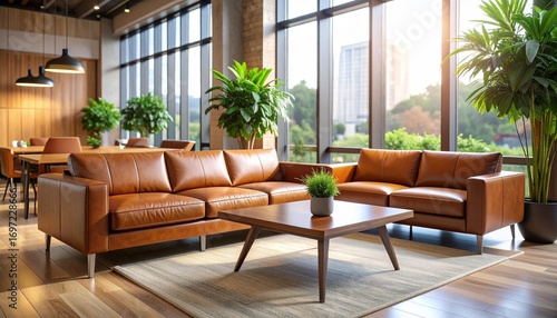 A sophisticated and sunlit modern office lounge, featuring comfortable brown leather sofas and lush plants, with a city view through expansive windows. A hyper-realistic render