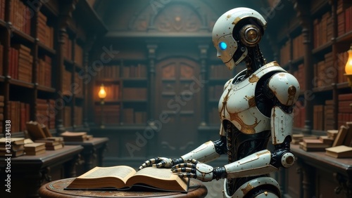A sophisticated automaton meticulously examines an antique tome within a grand, dimly lit library, its metallic fingers gently tracing the aged pages.