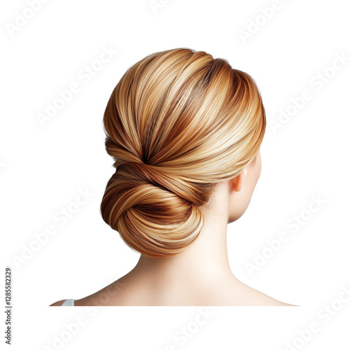 A sophisticated updo hairstyle showcasing smooth, shiny blonde hair styled in an elegant bun.
