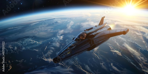 A spaceship is flying in space with the Earth in the background. The spaceship is mostly white with some red and blue markings.