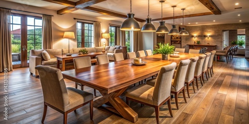A spacious dining room with a long wooden table in the center, surrounded by comfortable armchairs and floor lamps, creating a warm and inviting atmosphere, ambient lighting, rustic decor