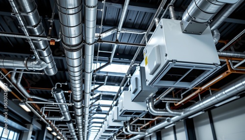 a spacious industrial room filled with numerous metallic ducts and pipes.
