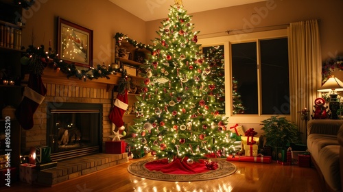 A sparkling Christmas tree with twinkling lights and ornaments creates a warm, joyful atmosphere.