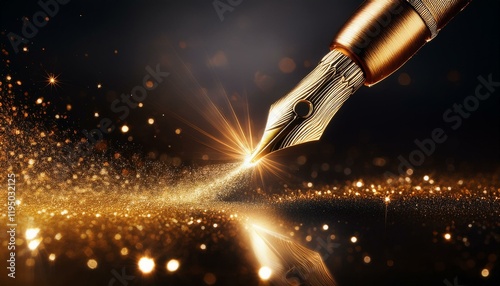 a sparkling pen tip producing golden light and shimmering effects against a dark backdrop