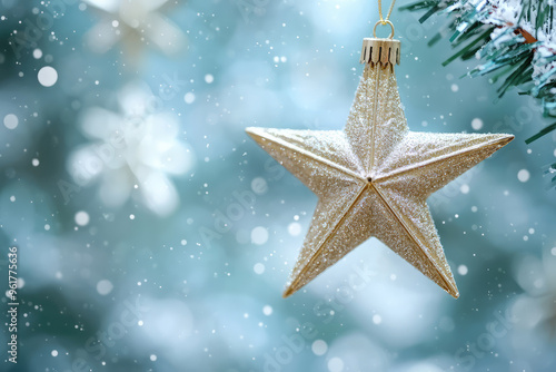 christmas, ornament, star, gold, glistering, winter, snowy, pine, tree branch, festive, holiday, celebration, decoration, bokeh, blurred, abstract, sparkle, shine, shimmer, light, joy, happiness, magic, magical, whimsical, fairy tale, christmas tree, winter landscape, festive season, joyful, celebratory, beautiful, sparkling, closeup, macro