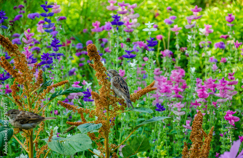 A sparrow is sitting in a garden among flowers on a summer day.
