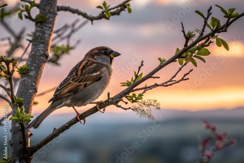 a sparrow on a tree branch,sunset