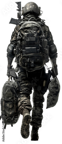 A special forces operator carrying leather luggage, ready for a covert mission, transparent background