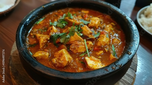 A spicy chicken curry served in a traditional stone pot.
