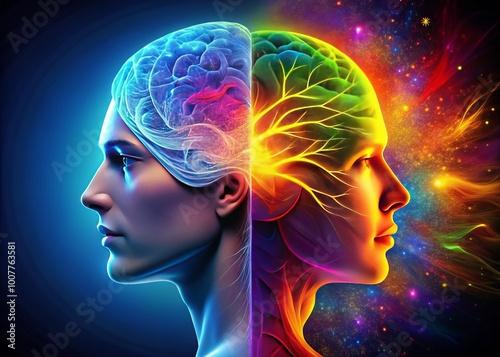 A split-brained illustrated concept depicts a rational, structured left side contrasting with a vibrant, emotive right