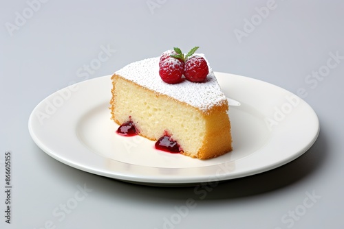 A sponge cake is sitting on a white plate