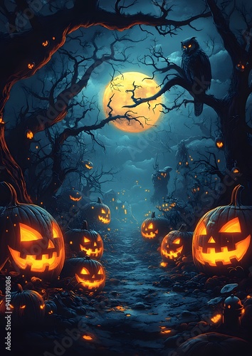 halloween, banner, three-dimensional, pumpkin, skittish, moon, scarey, owl, illustration, dark, tree, glowing, background, group, festive, autumn, october, night, creepy, haunted, party, horror, moonlight, fall, eerie, decorative, celebration, seasonal, nocturnal, event, holiday, spectral, frightful, mystical, twisted, perched, all, illuminated, bright